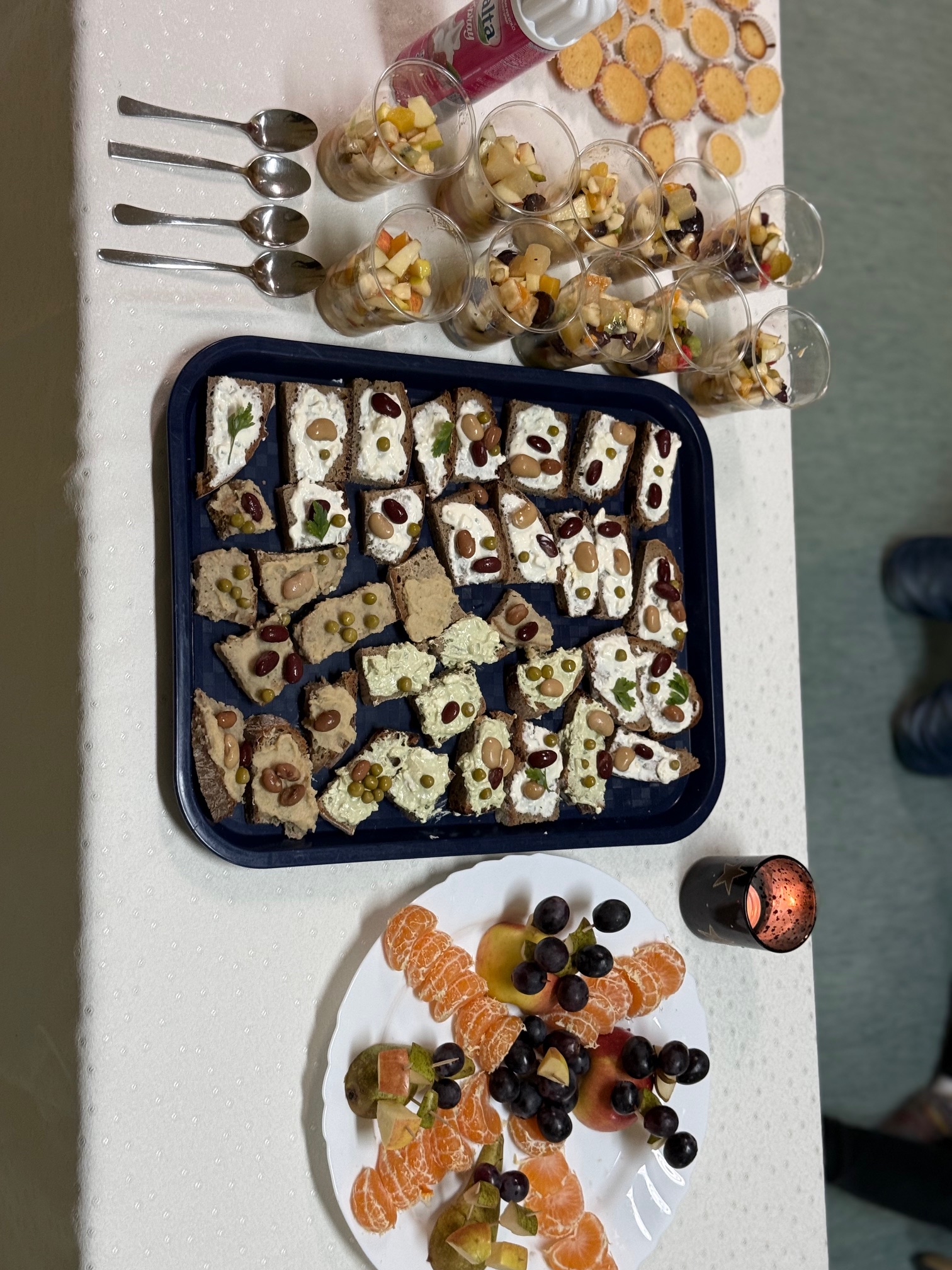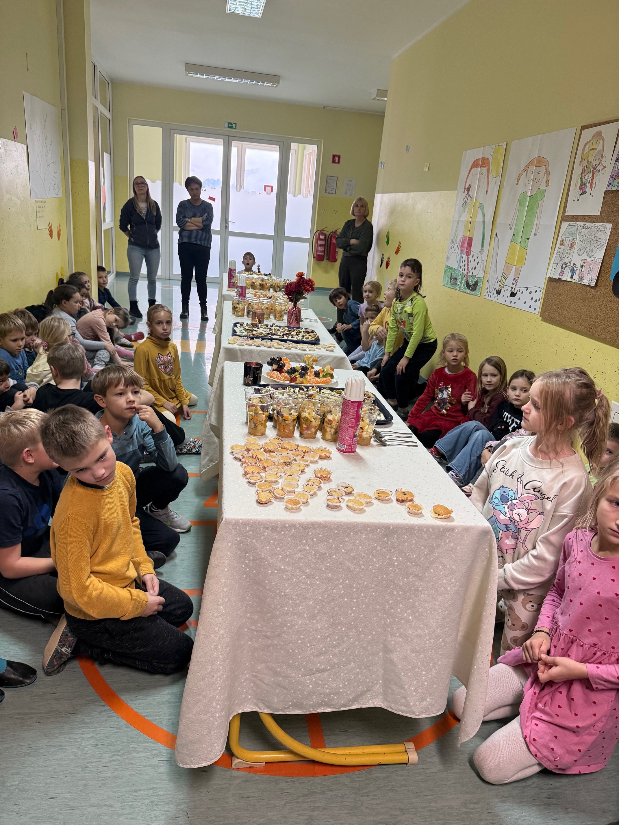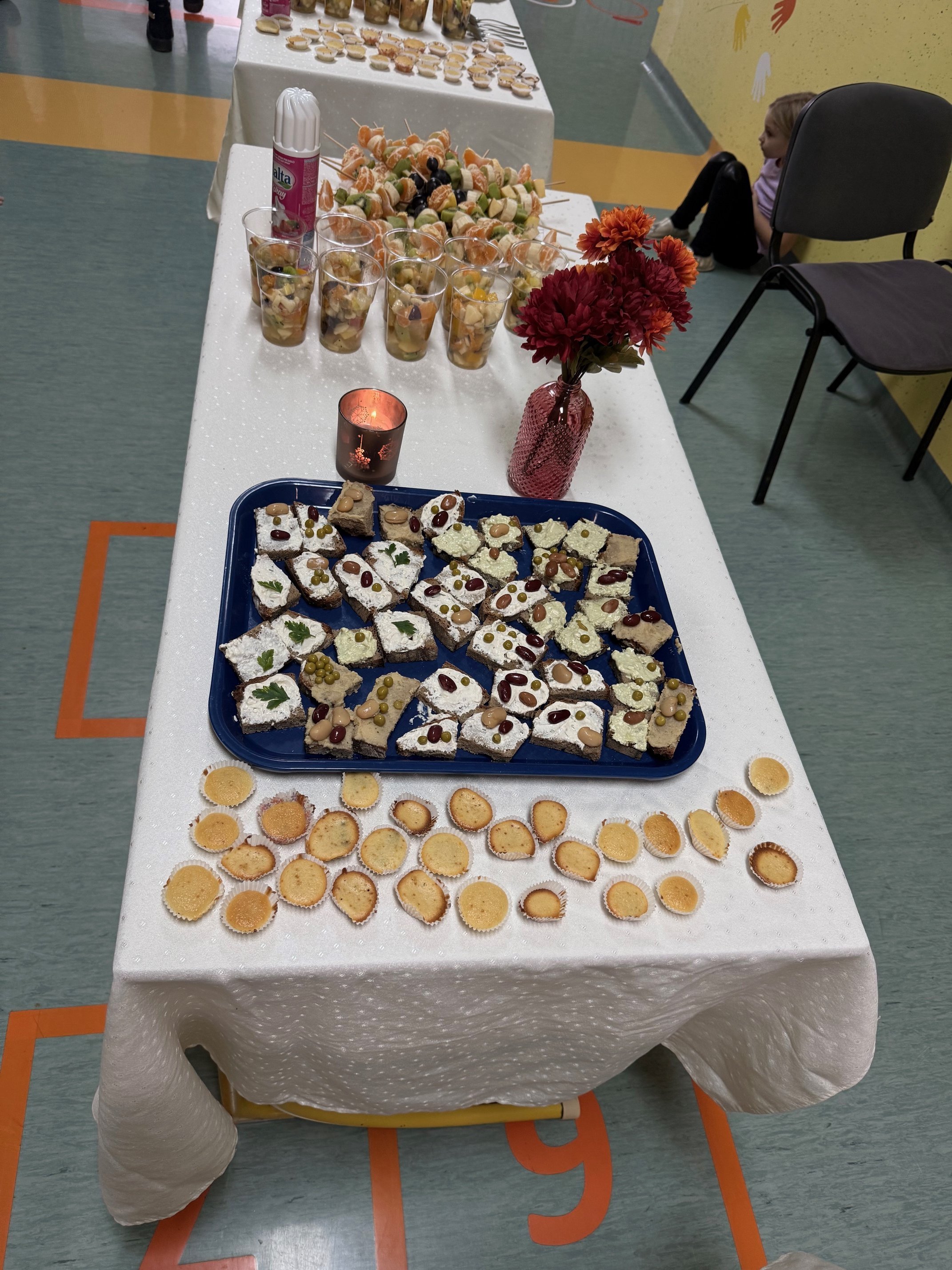 Po skupnem zajtrku smo se razredi lotili različnih praktičnih izzivov. Prvošolci so izdelovali zdrave namaze iz skute in stročnic. Drugošolci so pripravili bolj zdravo različico sladice, puhaste mafine. Tretješolci so ustvarjali sadne specialitete – sadna nabodala in sadne kupe ter ob tem vadili vzorce. Obiskali so tudi sejem zdravja, ki so ga pripravili petošolci. Ostali razredi pa smo se medtem naučili nov skupinski ples.