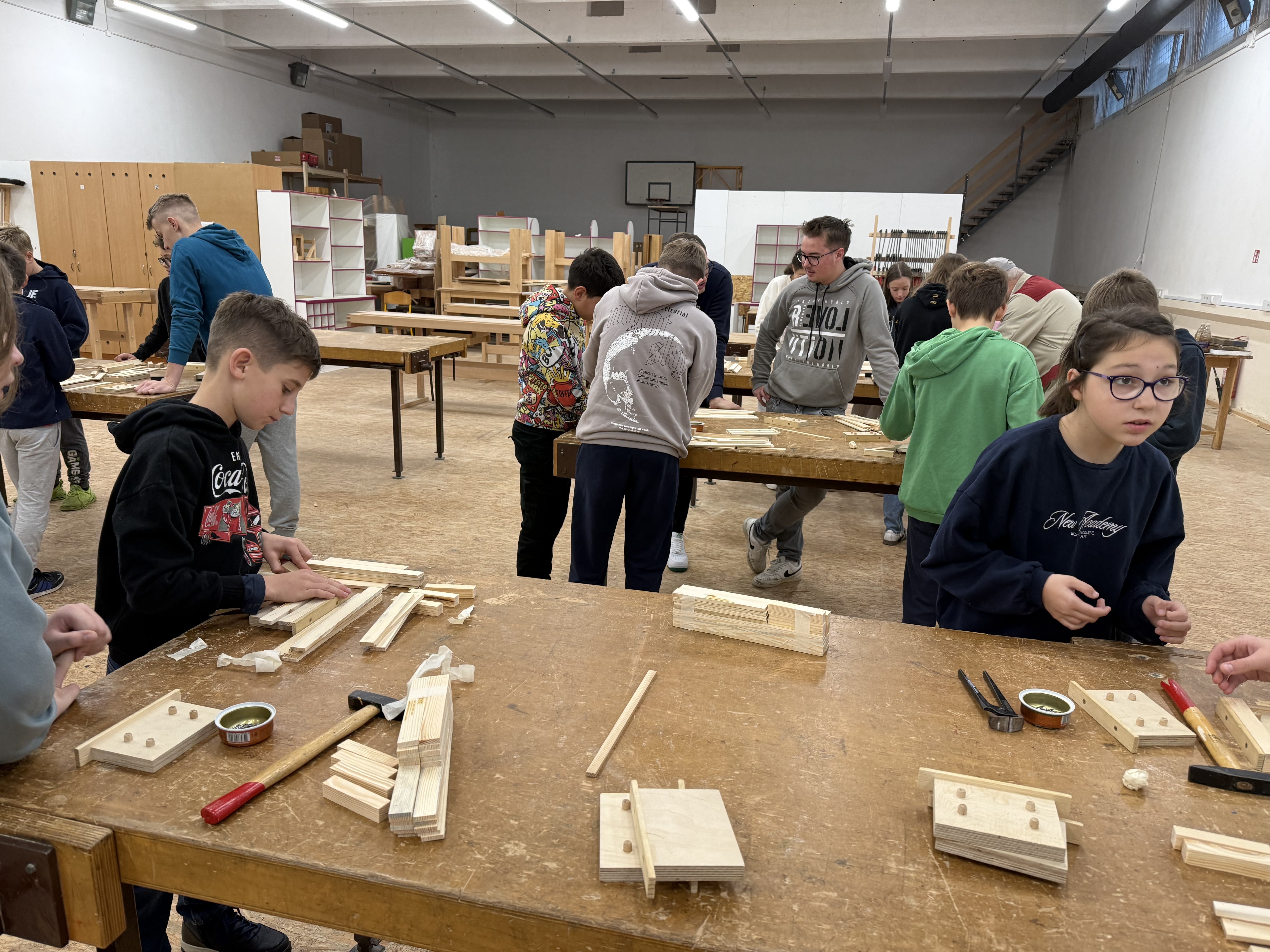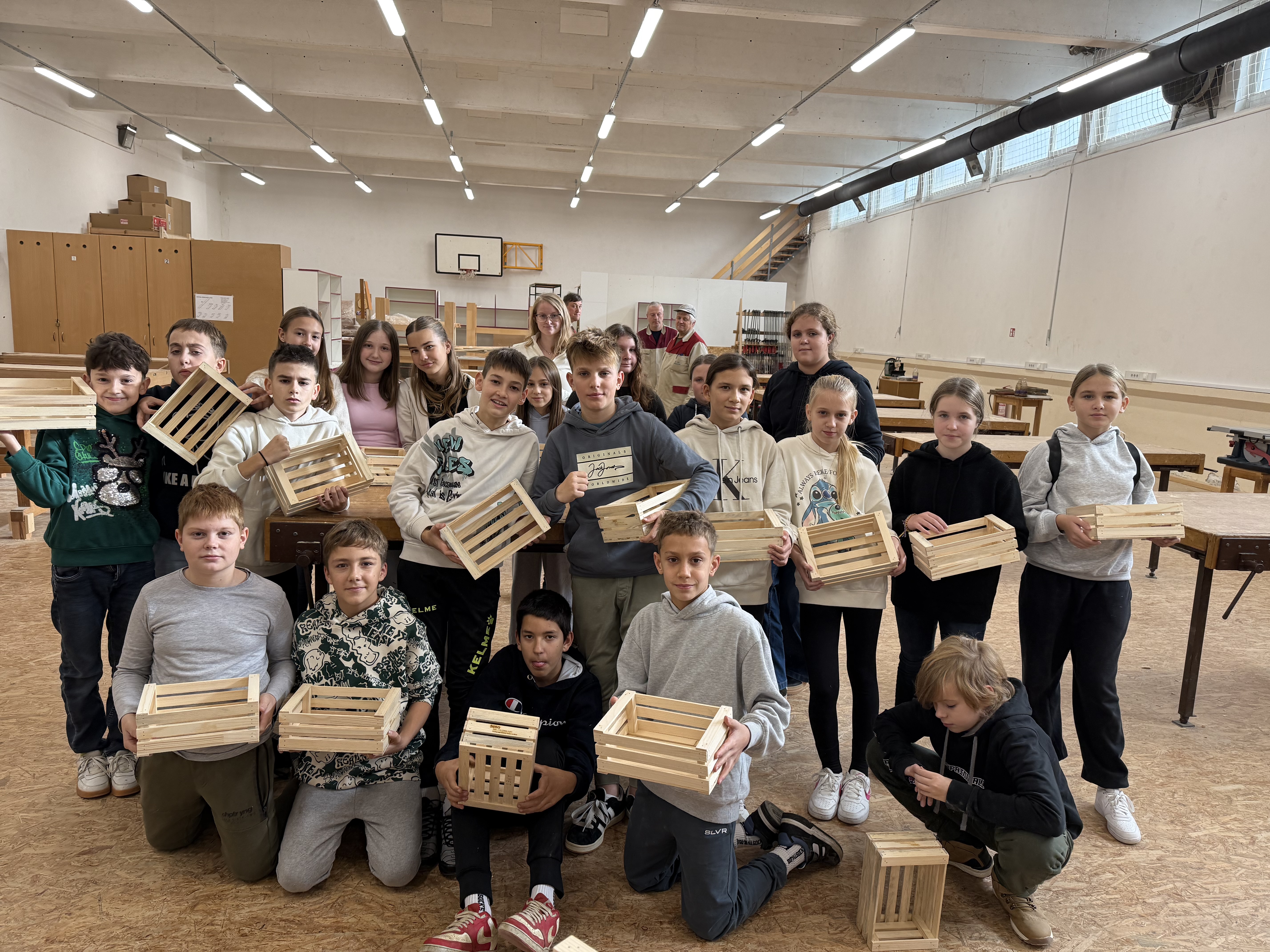 Zjutraj smo prišli v šolo in ob pol osmih sedli k malici. Nato smo se z avtobusom odpeljali na Šolski center Slovenj Gradec, kjer so nas sprejeli profesorji in dijaki Srednje lesarske šole, ki so nam pomagali tudi pri izdelavi izdelkov. V parih smo izdelovali majhne lesene »gajbice« (zaboje).