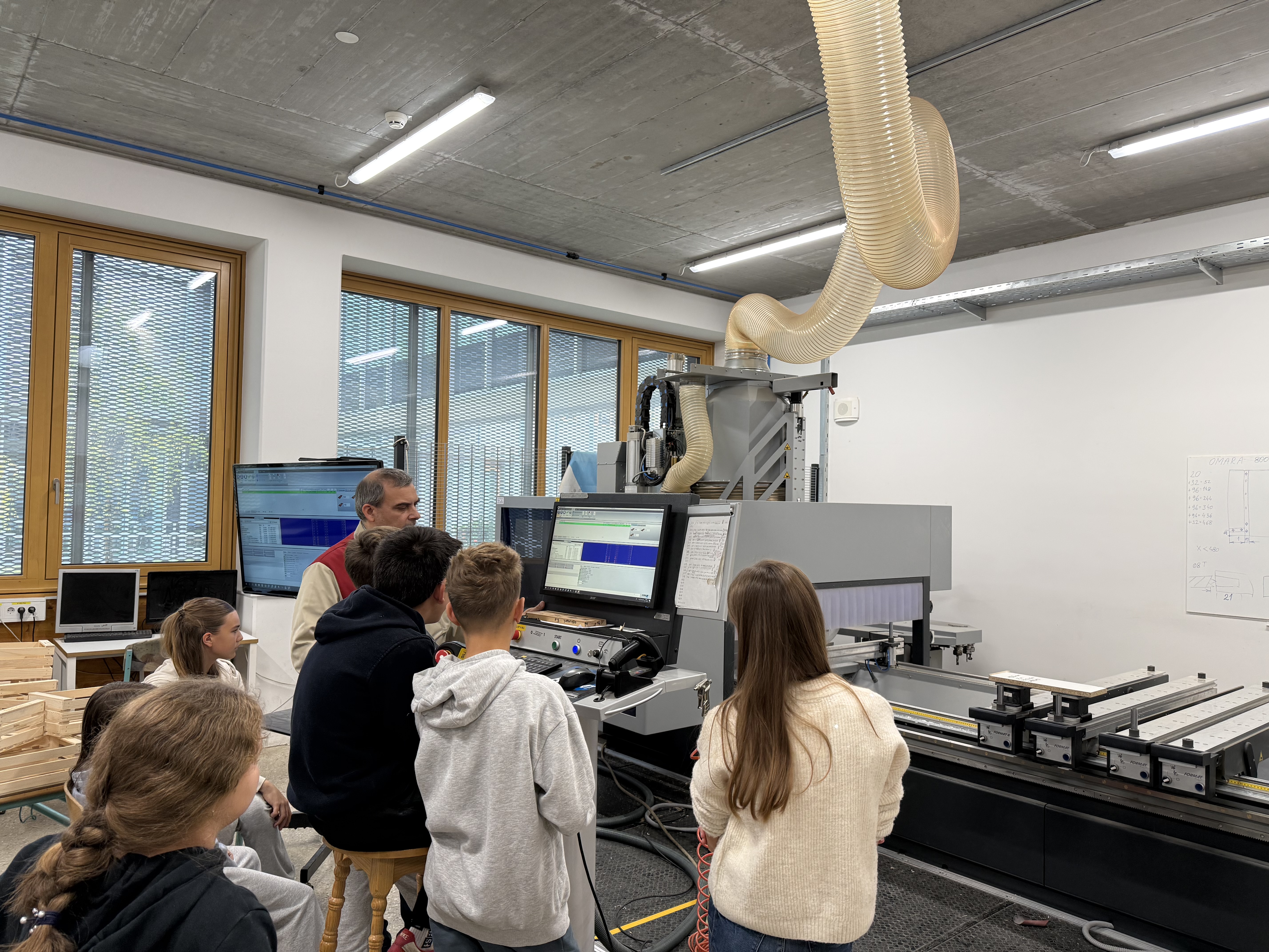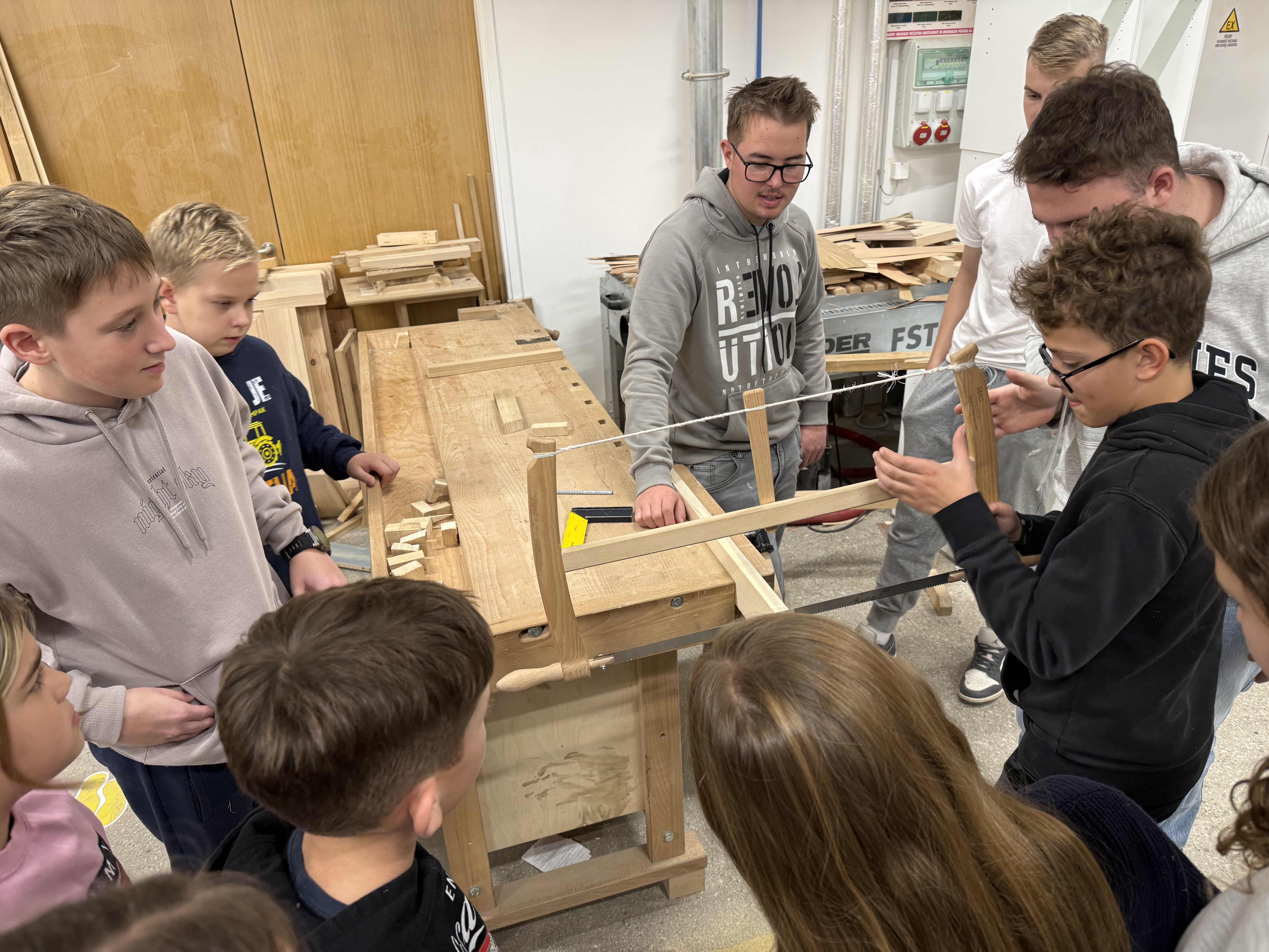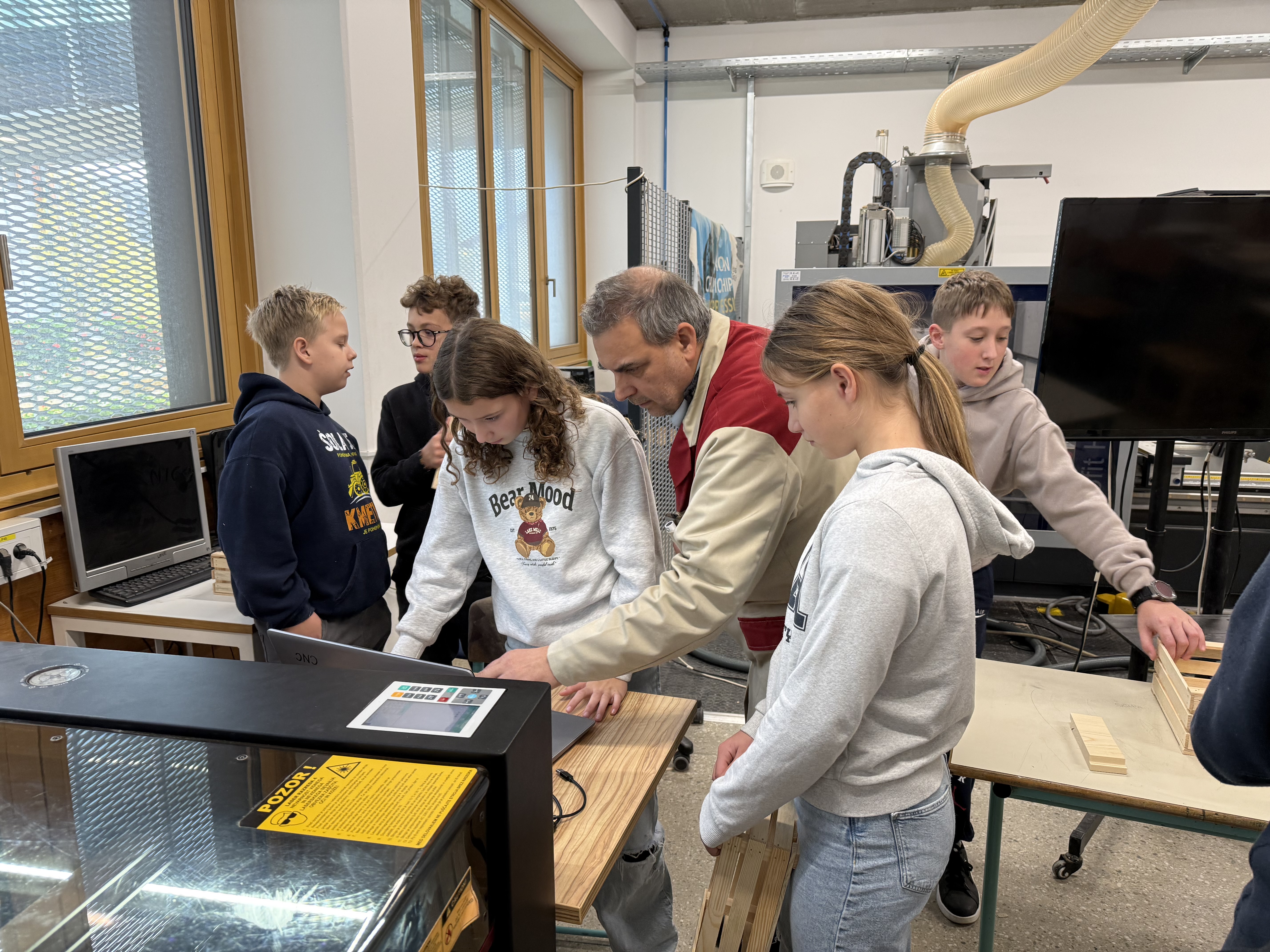 Nato smo šli še v delavnico, kjer smo si ogledali stroje, vrste lesa in košček tega tudi sami odžagali. Peljali so nas tudi v sobo z laserjem, kjer smo na gajbice napisali še svoje ime. Njihov profesor nam je razložil, kako deluje stroj za izrezovanje lesa.