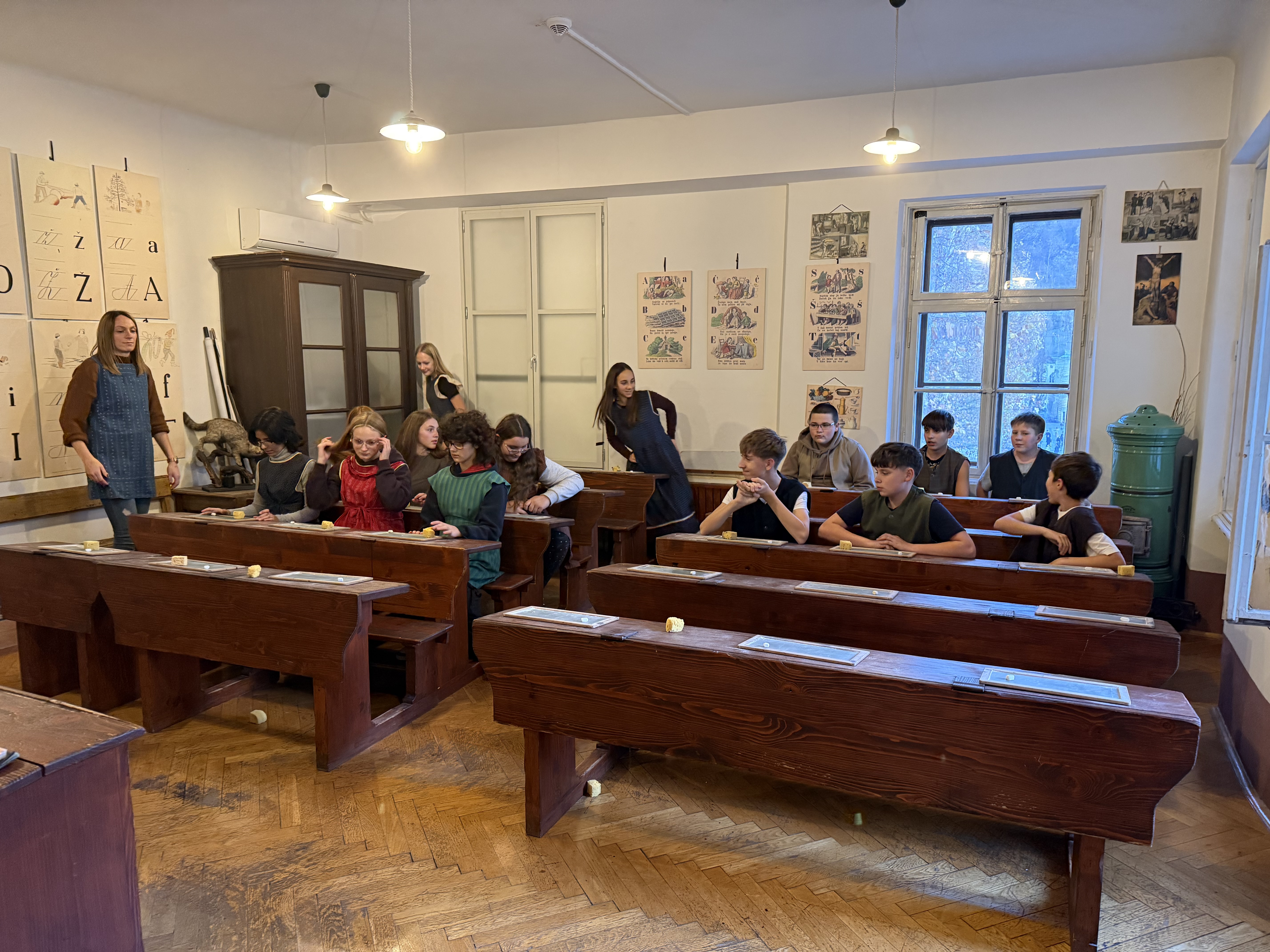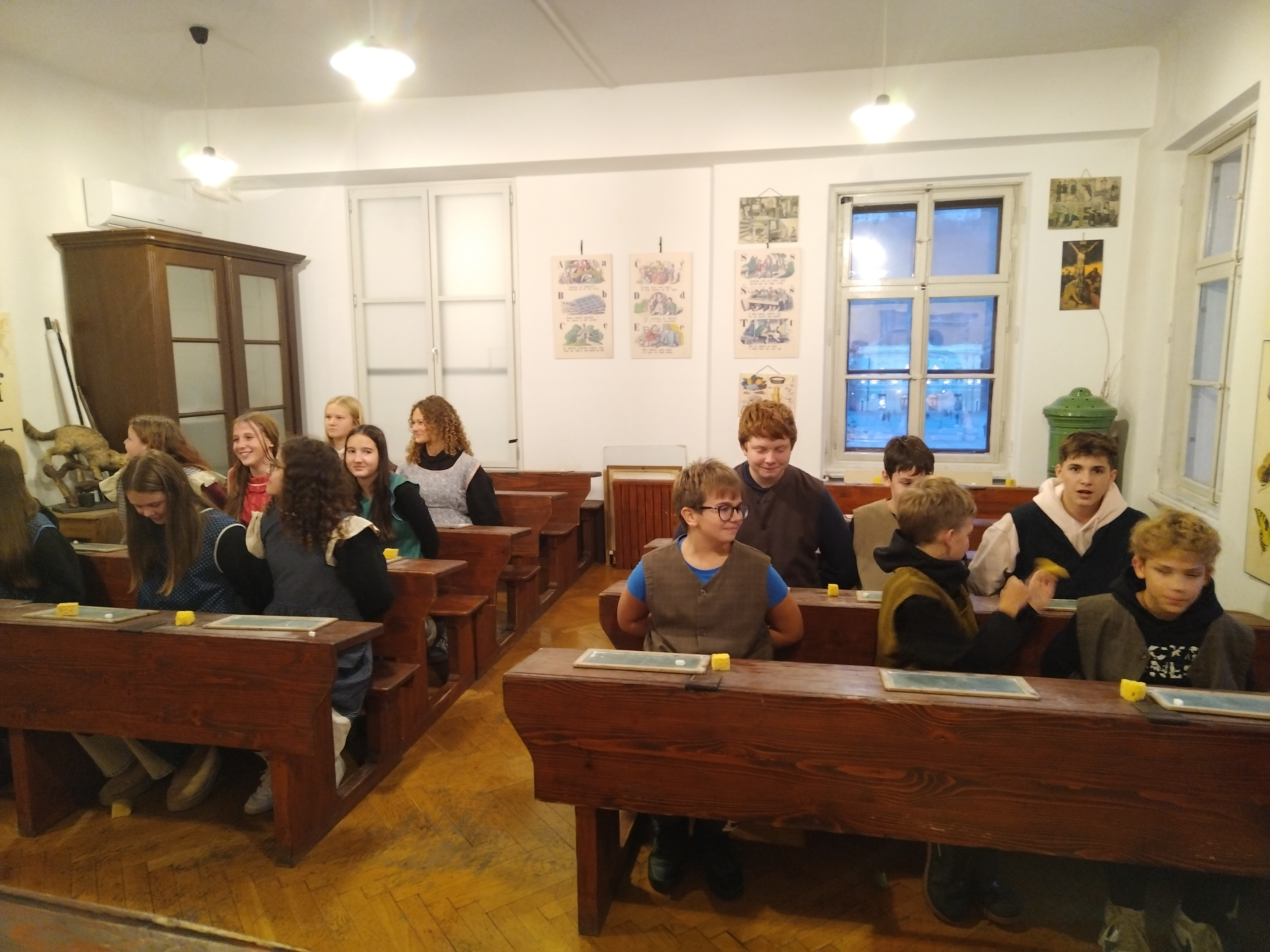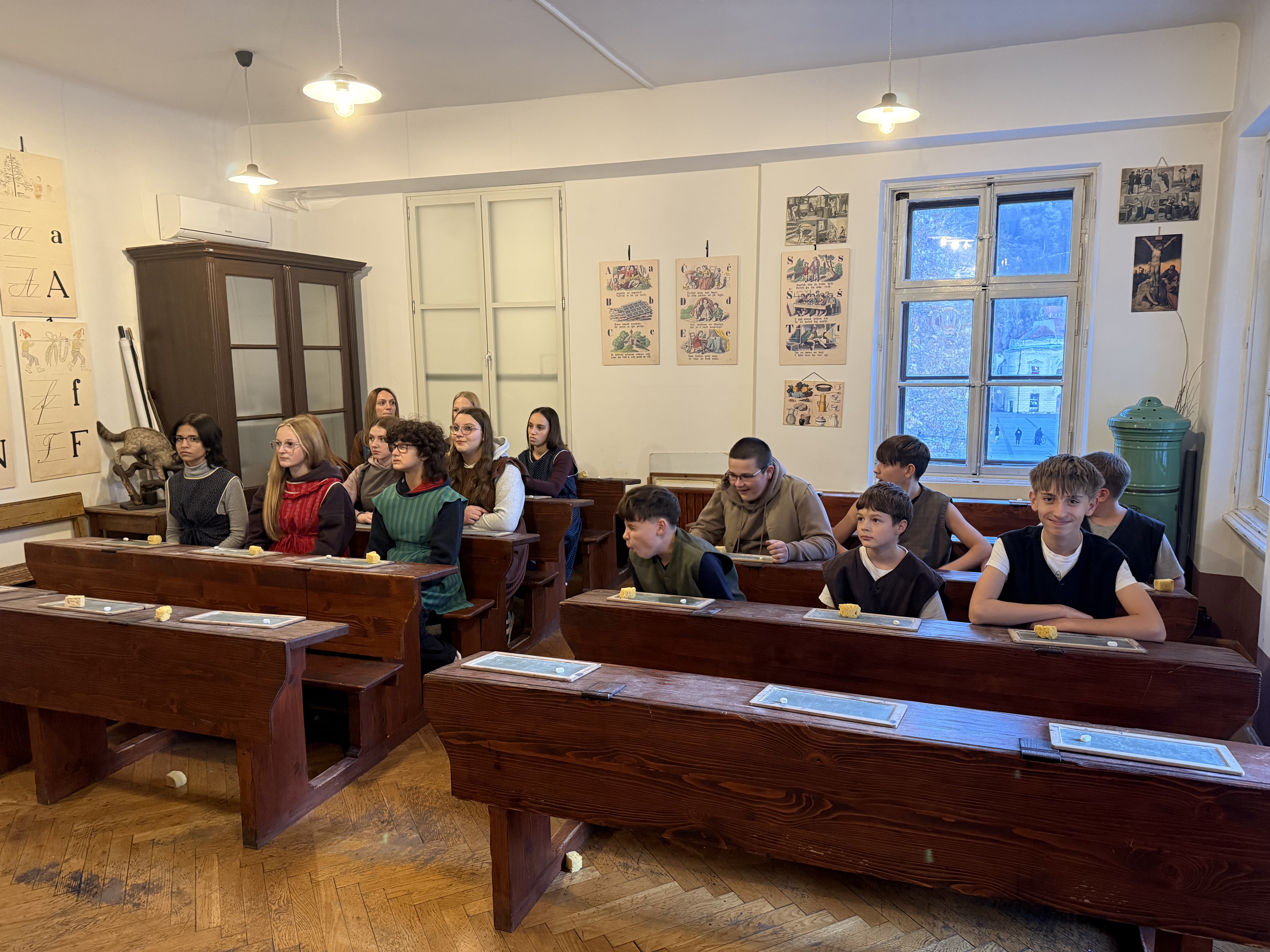Nato nas je pot vodila še v Šolski muzej v Ljubljani, kjer smo si ogledali stalno razstavo o šolstvu nekoč in doživeli učno uro naših babic iz leta 1907, zato smo se preoblekli v uniforme ter preizkusili takratne stroge vzgojne metode (klečanje na koruzi, nošenje osla).