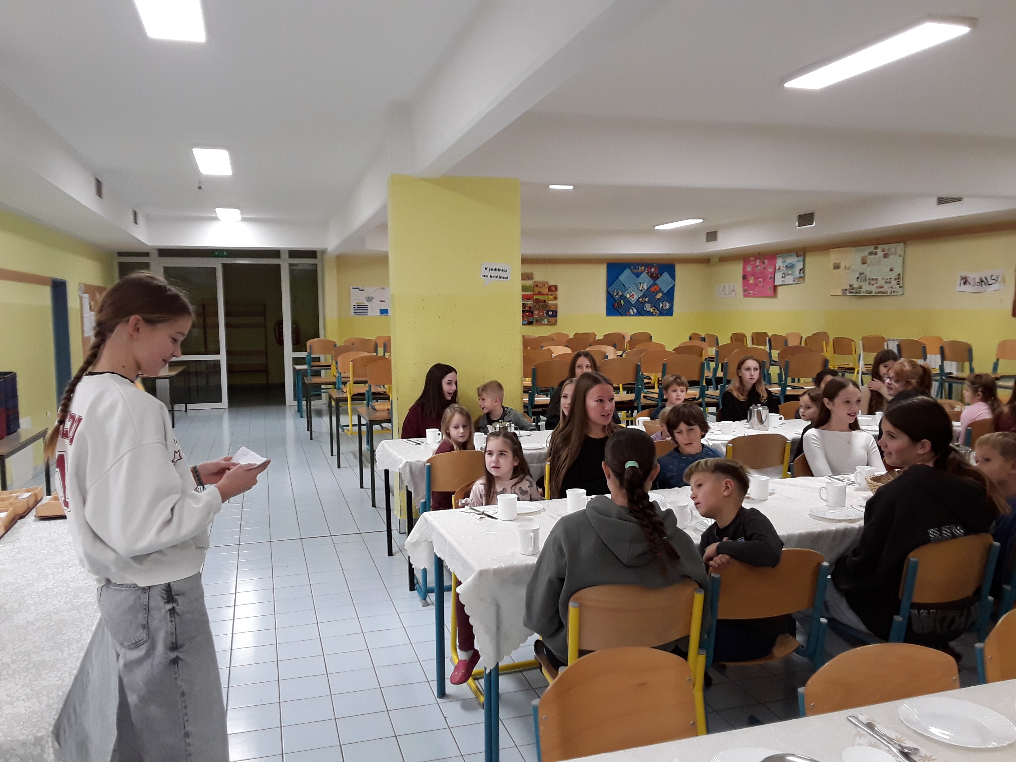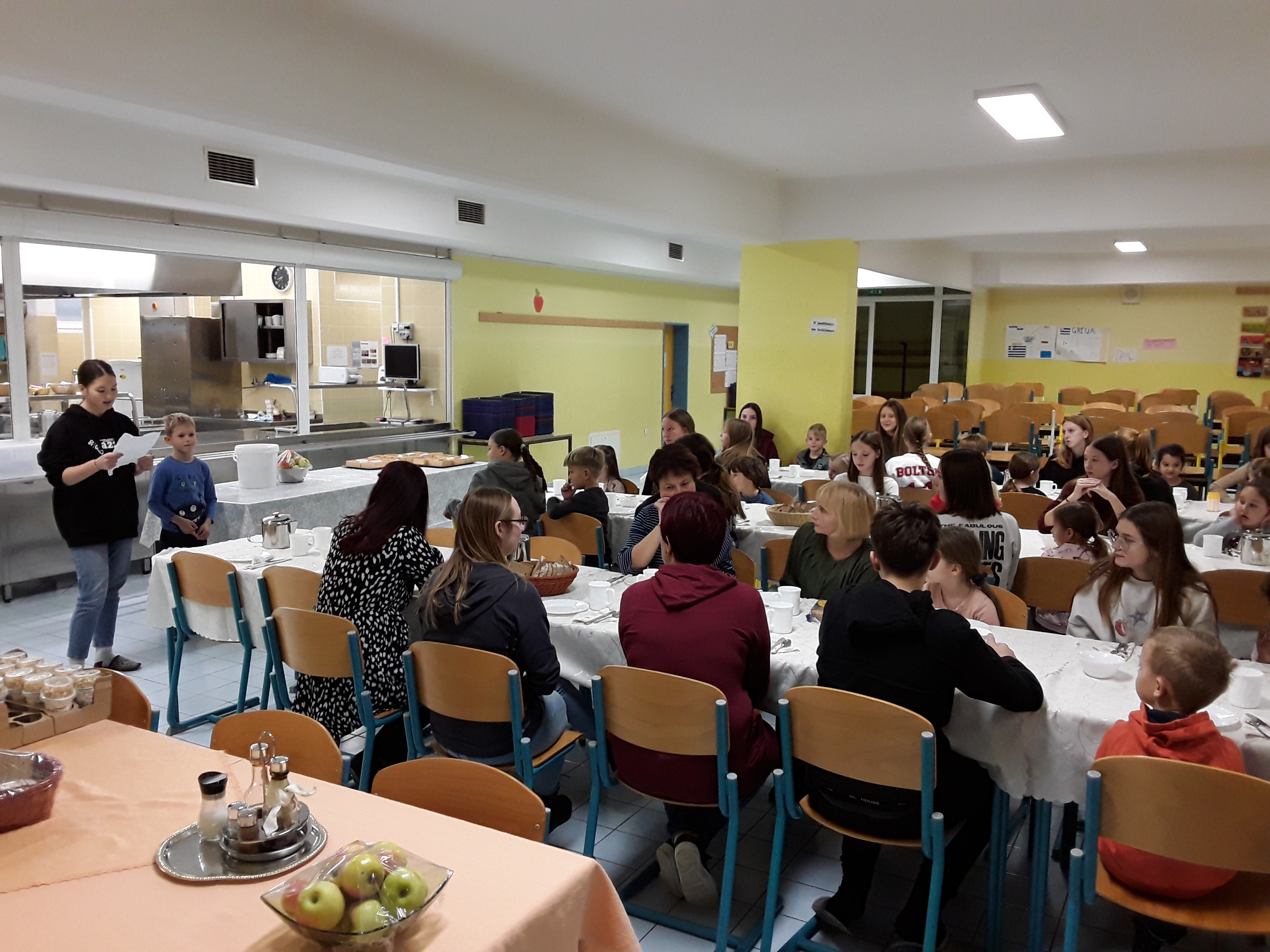 Dan smo zaključili s kratko prireditvijo ob koncu Tradicionalnega slovenskega zajtrka, kjer so učenci prebrali nekaj pozdravov iz pozdravne skrinjice. Tako sta se povezala skrb za zdravo prehrano in širjenje prijaznosti.
