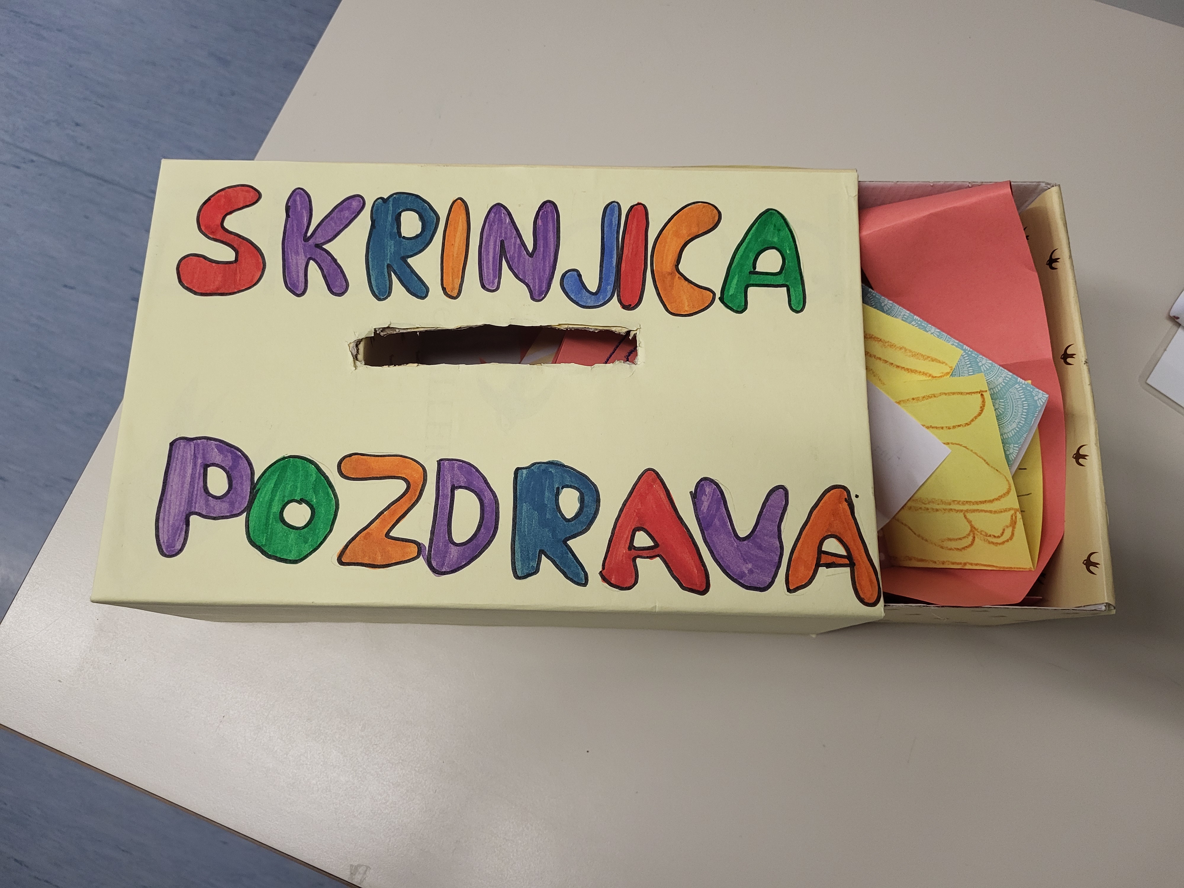 V avli šole je stala pozdravna skrinjica, v katero so učenci odlagali prijazne misli, pozdrave in pohvale. Nabralo se je veliko lepih sporočil.